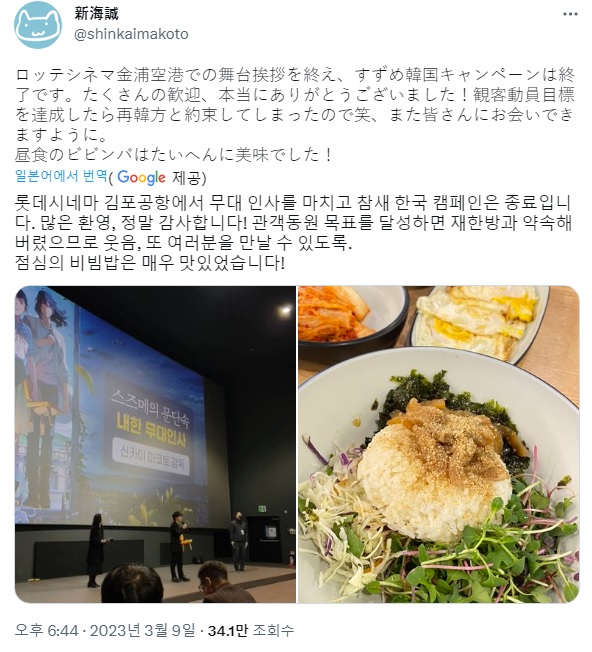 실제로 신카이 마코토 감독은 한국 드라마 '도깨비'에 영감을 받아서 '스즈메의 문단속'을 만들었다고 밝혔으며, 한국에 오는 걸 너무 좋아해서 영화를 만드는 목적 중 하나가 한국 방문이라고 말하기도 했습니다. 또한 방한 당시 작성한 트윗들을 보면, 실제로는 한국에서도 비빔밥 등 다양한 음식을 즐긴 것으로 보이며, 한국에서의 높은 관심과 흥행에 매우 큰 기쁨을 표시하고 소주를 마시고 싶다는 소감을 남기기도 했습니다.