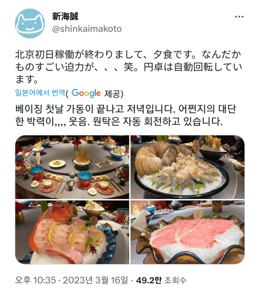 하지만 이런 신카이 마코토 감독의 한국 방문과 친근한 모습에도 불구하고, 중국에서는 완전히 다른 내용으로 허위 선동을 하기 시작합니다. 중국 배급사는 신카이 마코토 감독이 베이징에서 저녁 먹은 인증샷과 함께 "중식 최고!"라고 적었다가, 이후 한국 배급사가 보내준 김치 사발면 사진과 함께 "이것도 이것대로 맛있어 보인다"라고 적었다는 것을 들추어내서, 중식과 김치 사발면을 비교하여 한국 배급사가 공식 만찬 대접 대신 컵라면 하나로 푸대접했다고 비난하고, 신카이 마코토 감독이 혐한 발언을 했다고 주장하기 시작했습니다. 하지만 이런 소문은 전혀 사실과 다른 것으로 밝혀졌습니다.