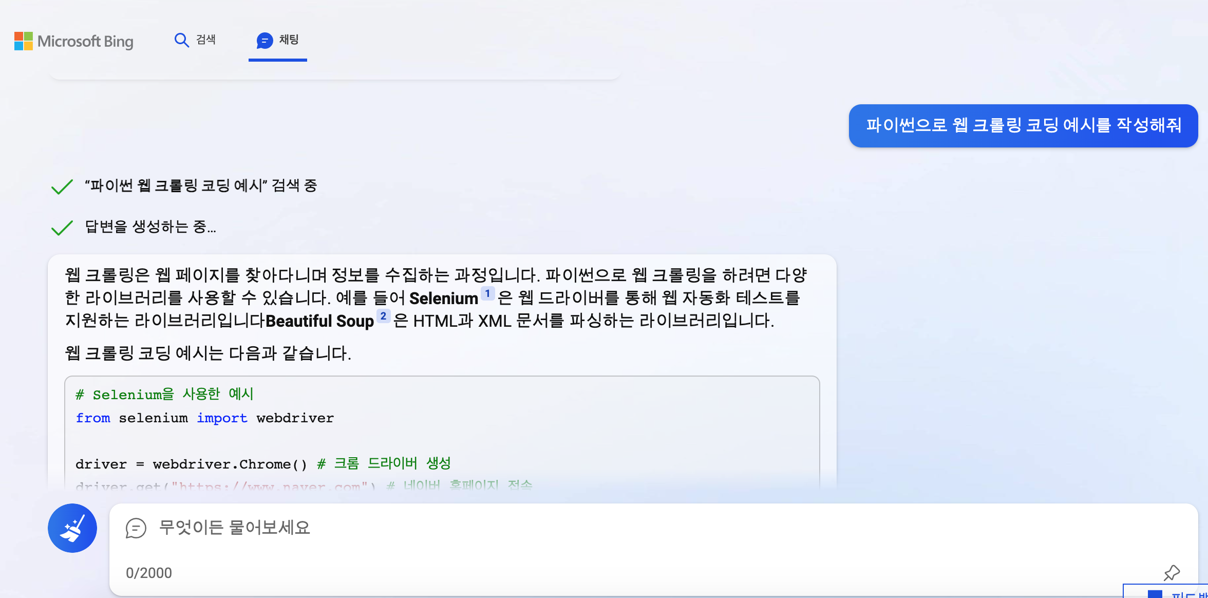 단순한 지식검색 뿐만 아니라 코딩에 대한 질문을 할 수도 있는데요. 파이썬으로 웹 크롤링하는 코딩 예시를 간단하게 요청해 보았더니 바로 파이썬에서 쓸 수 있는 코딩을 주석까지 완벽하게 보여줍니다.