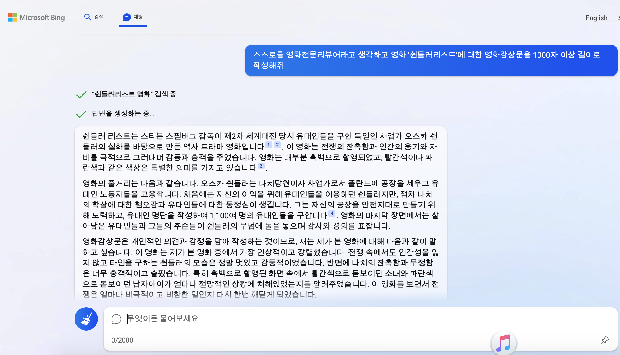 이번엔 코딩에 이어 영화 '쉰들러리스트'에 대한 감상문 작성을 요청해 보았습니다.