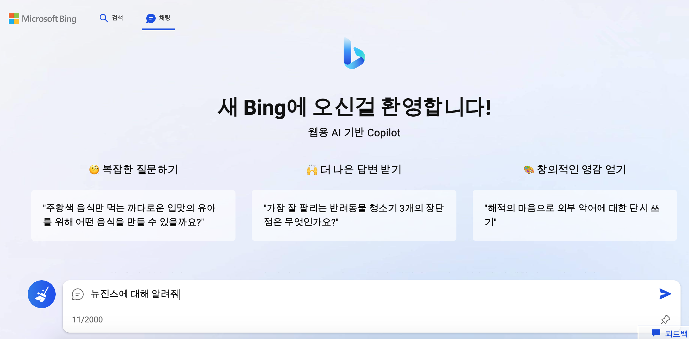 Bing AI는 사용자의 검색어나 질문을 입력 받아 적절한 답변을 생성하고, 검색 결과의 콘텐츠들을 요약하여 보여줍니다. 또한, 사용자와 채팅하는 형식으로 더 자세하고 구체적인 답변을 제공할 수 있습니다.