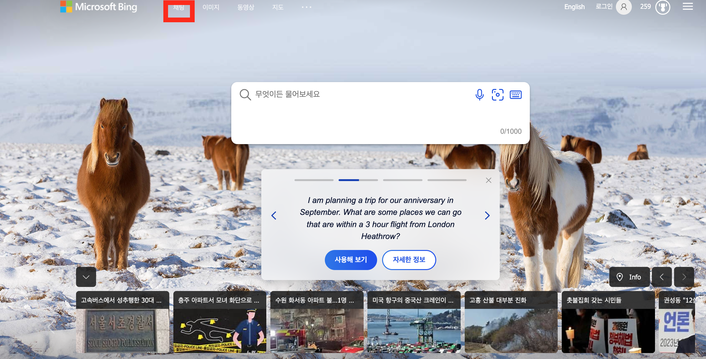 - 마이크로소프트 엣지 브라우저에서 빙 검색엔진(www.bing.com)으로 들어갑니다.